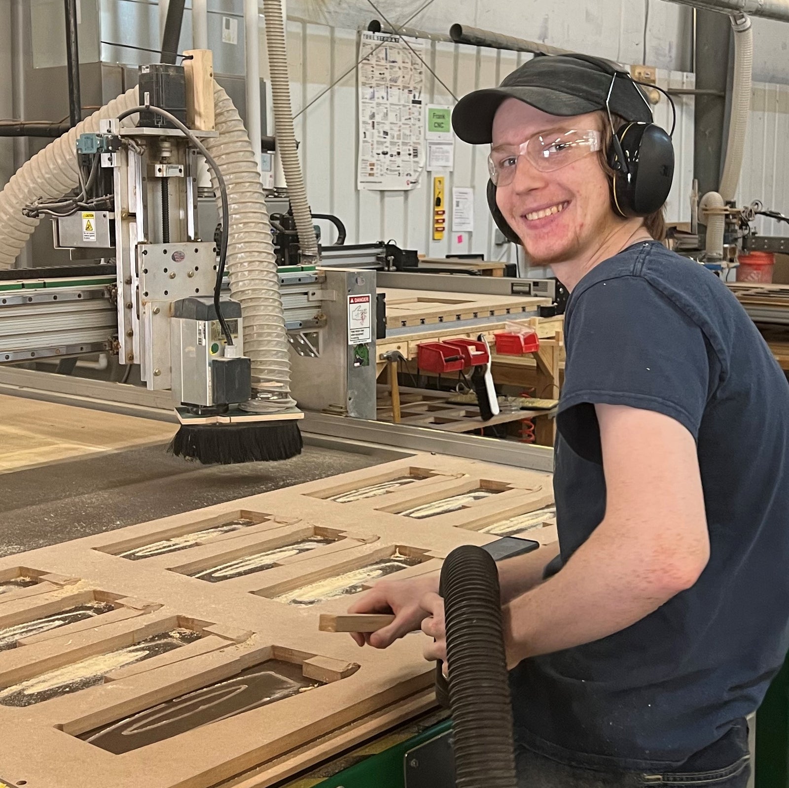 Each piece of wood is carefully cut, routed, sanded, and stained or sealed.